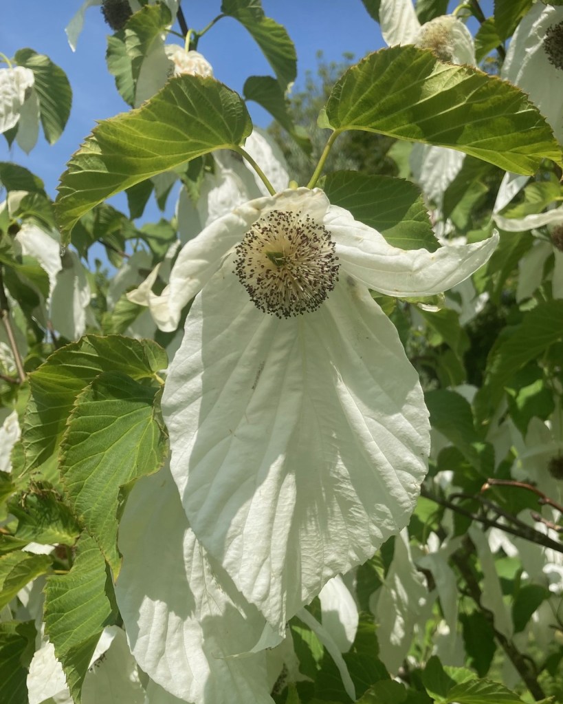In 1869, Père Armand David, Catholic missionary, botanist, and zoologist, became the first westerner to see this tree near Moupin (now Baoxing) in Sichuan province. He sent specimens and seeds to the Jardin des Plantes in Paris, but the seeds were preserved along with herbarium specimens rather than sown. Previously unknown to western science, a new genus was created for it and named in honour of Père David. (The first description of it, based solely on the herbarium specimens, had the long white bracts pointing up instead of drooping down).